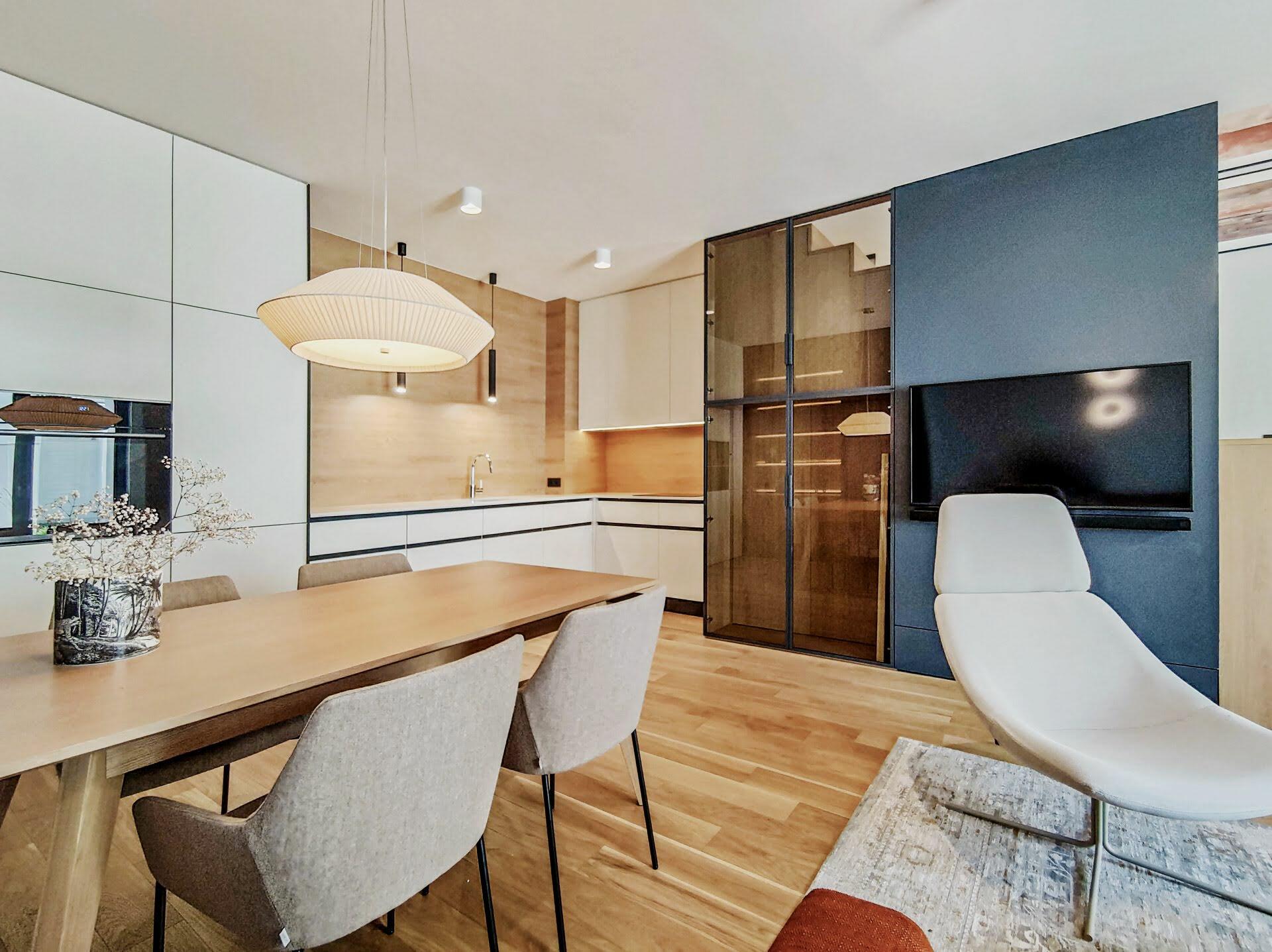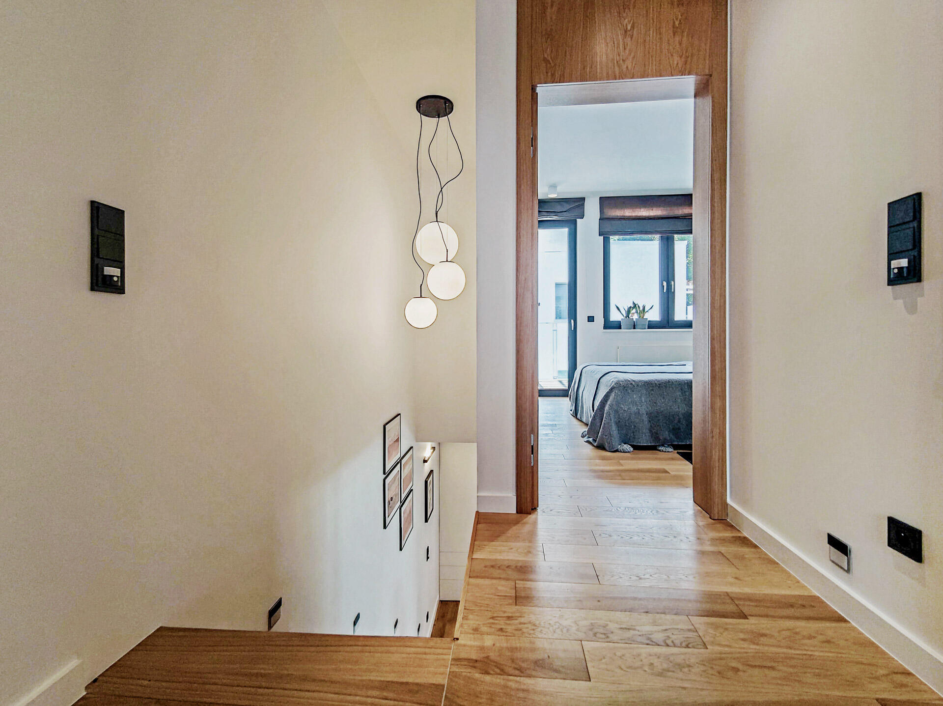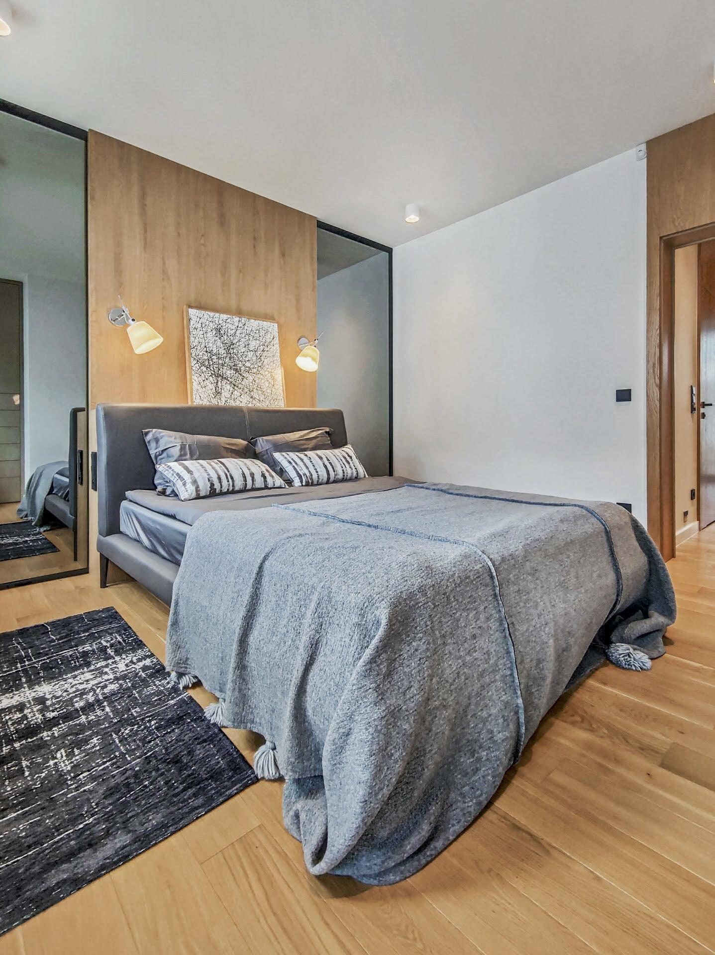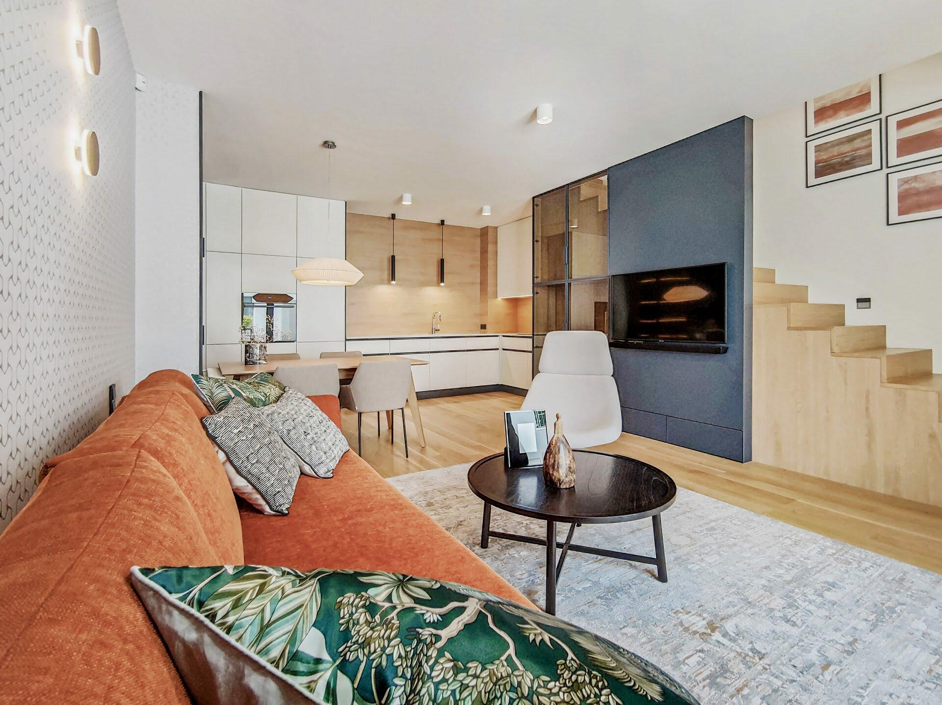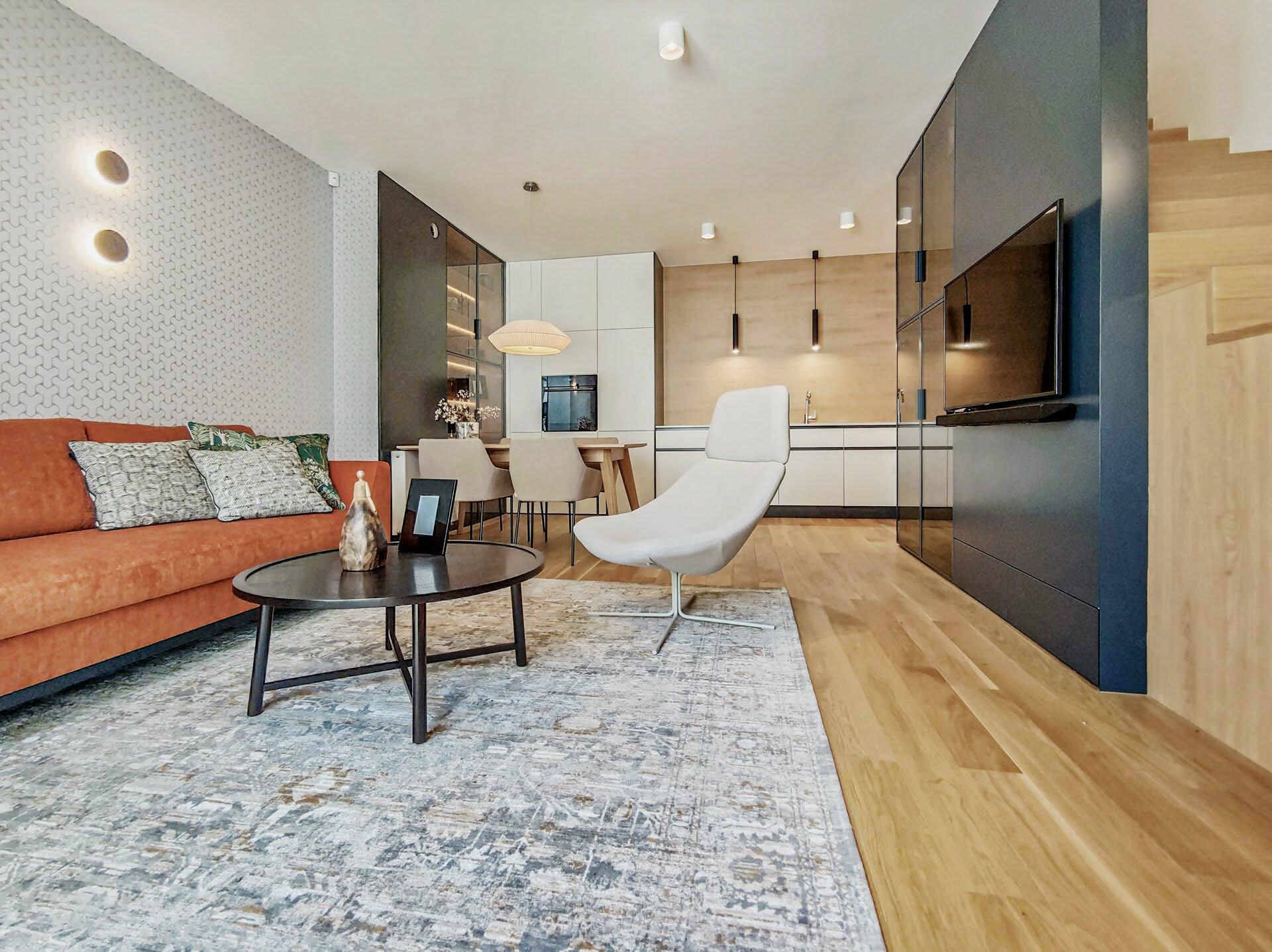 Apartament o powierzchni użytkowej 79,03 m2 dwupoziomowy, jasny, wykończony w wysokim standardzie. Dolną kondygnację zajmuje przestronny salon z aneksem kuchennym. Prywatna część apartamentu, czyli dwie sypialnie (każda z tarasem) i łazienka zajmują górną kondygnację. Meble wykonane na zamówienie tylko dla tego apartamentu. Sprzęty RTV i AGD wysokiej klasy. Podłogi w pokojach i na schodach - deska drewniana.