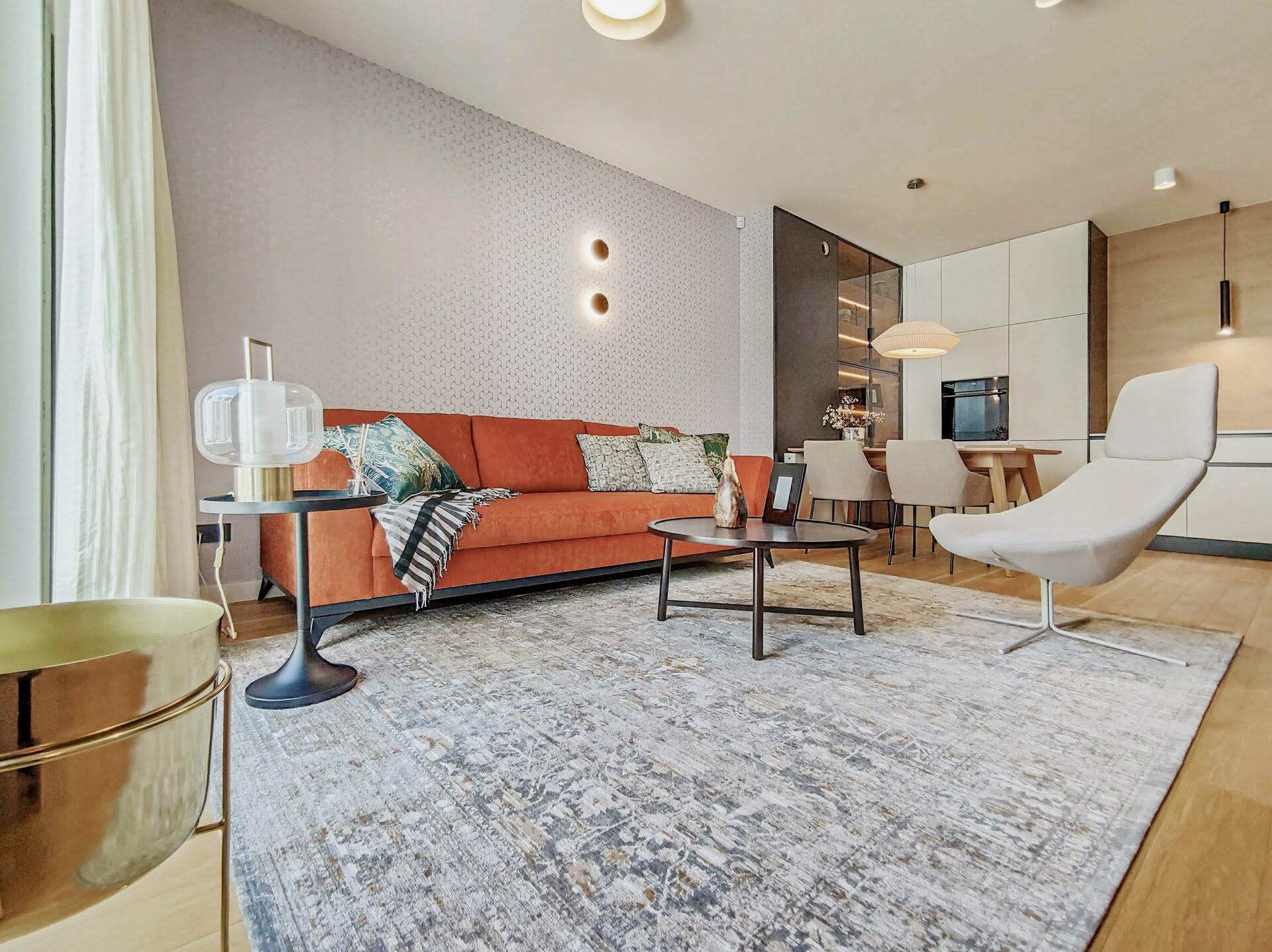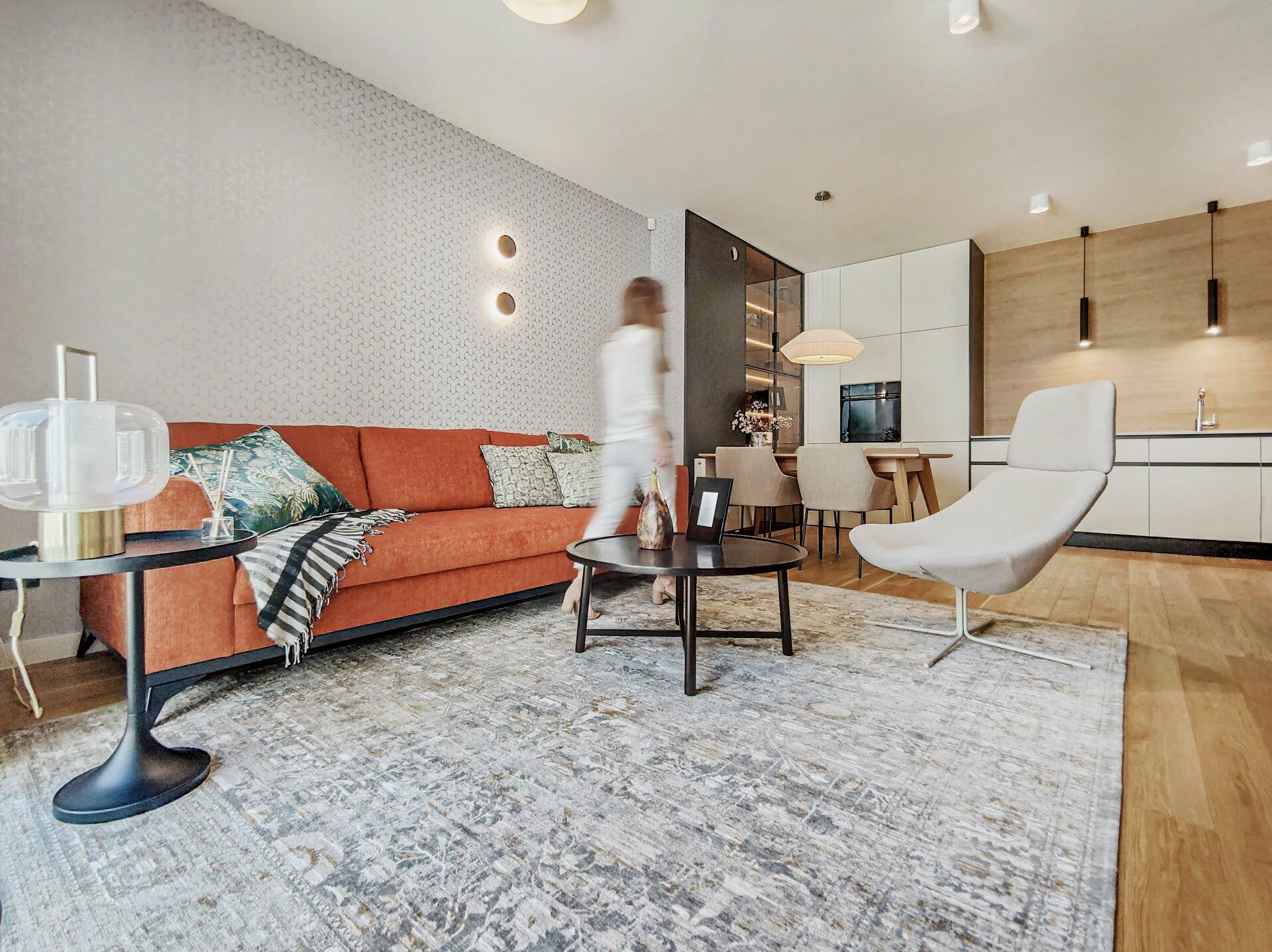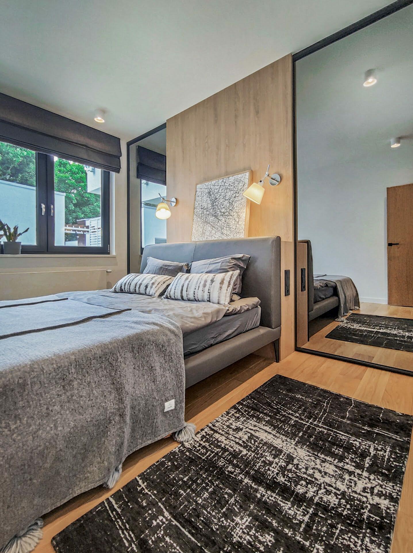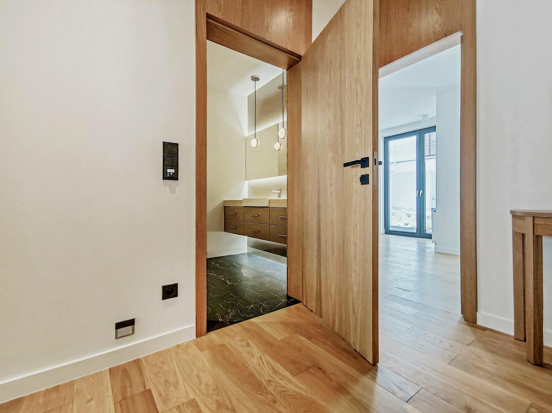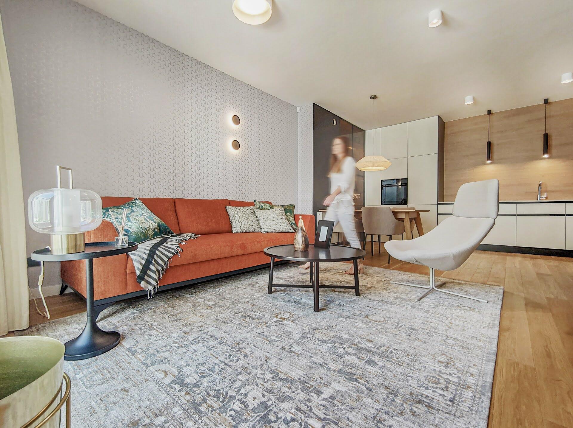 Apartament o powierzchni użytkowej 79,03 m2 dwupoziomowy, jasny, wykończony w wysokim standardzie. Dolną kondygnację zajmuje przestronny salon z aneksem kuchennym. Prywatna część apartamentu, czyli dwie sypialnie (każda z tarasem) i łazienka zajmują górną kondygnację. Meble wykonane na zamówienie tylko dla tego apartamentu. Sprzęty RTV i AGD wysokiej klasy. Podłogi w pokojach i na schodach - deska drewniana.
