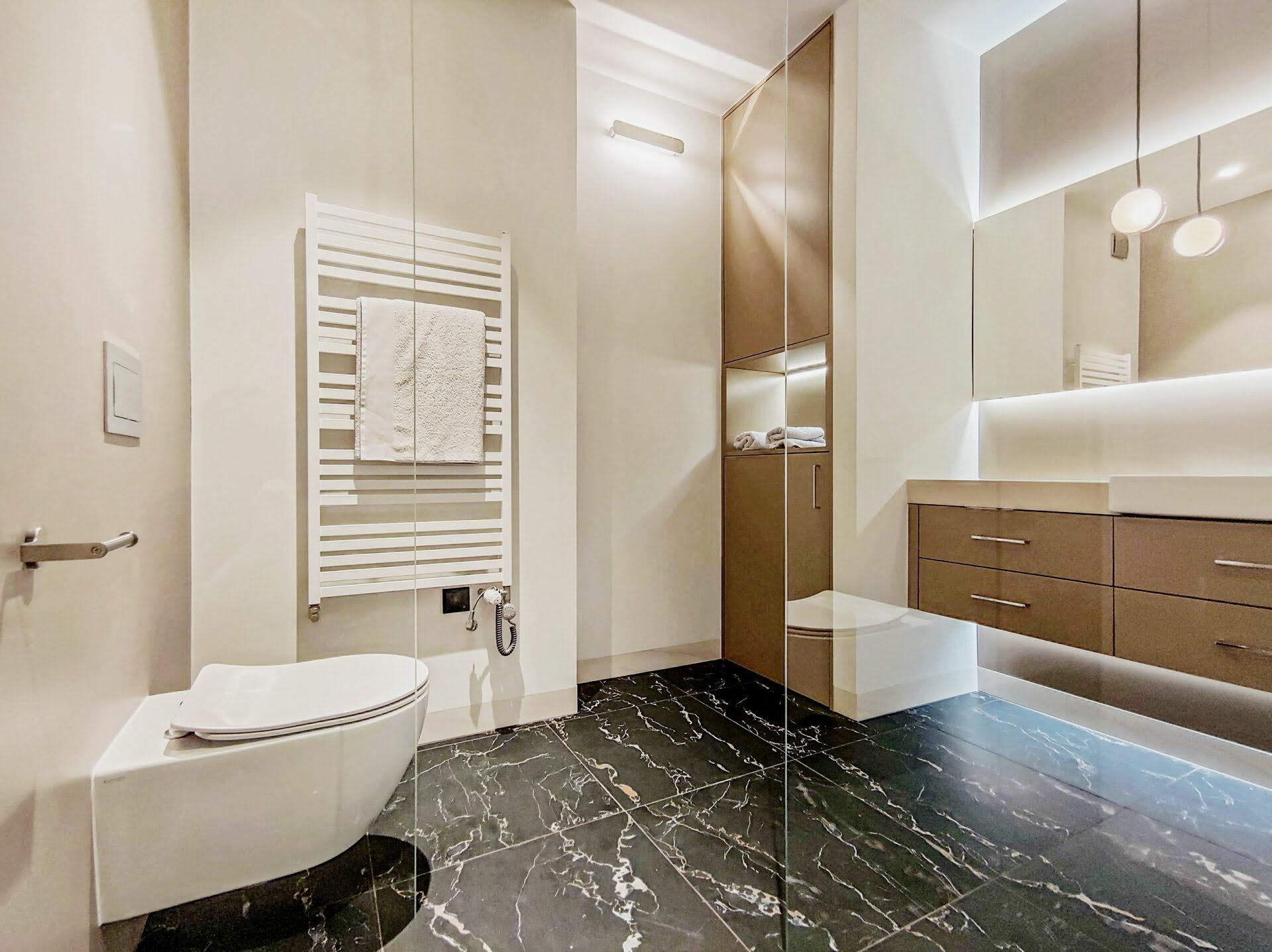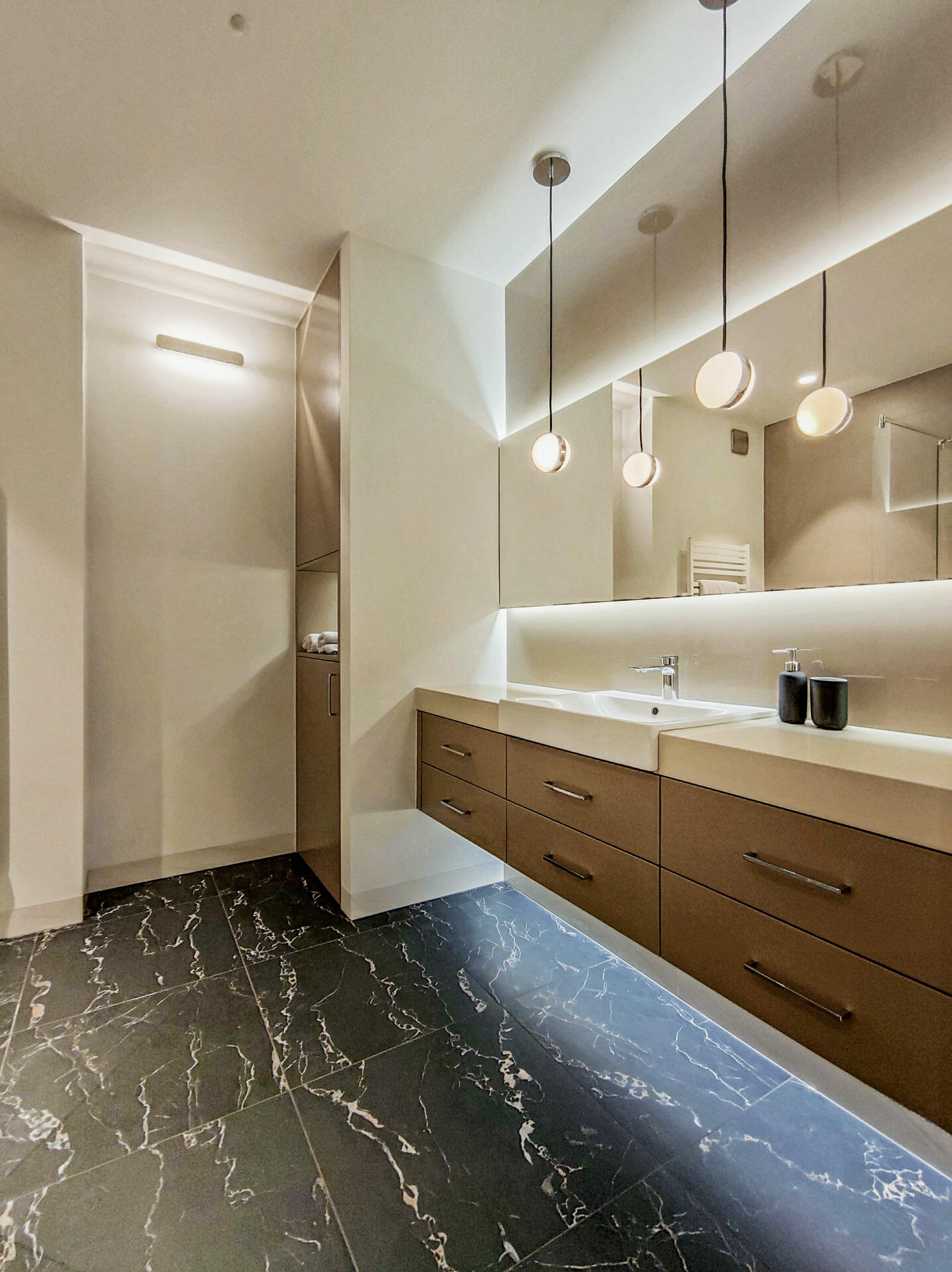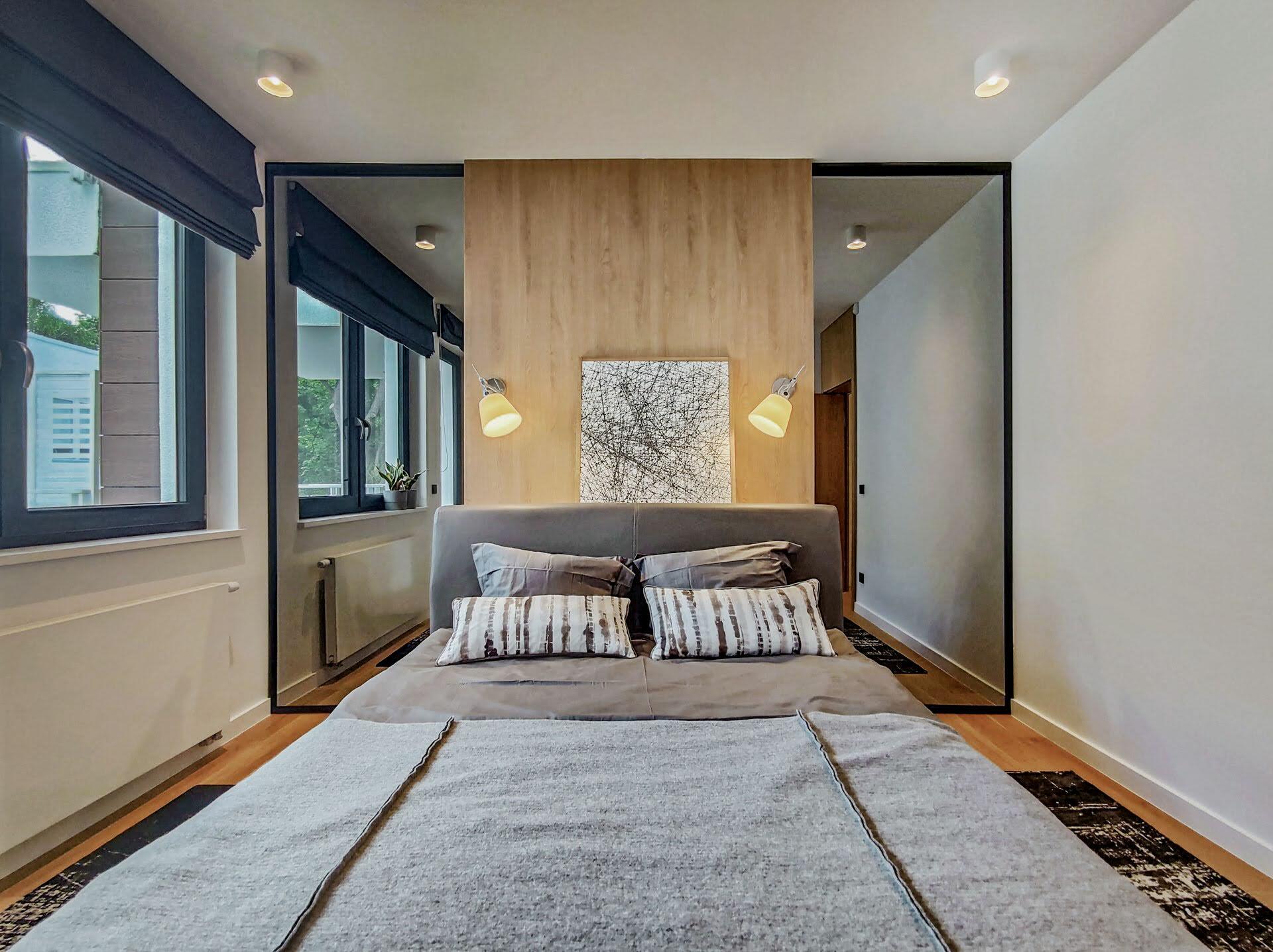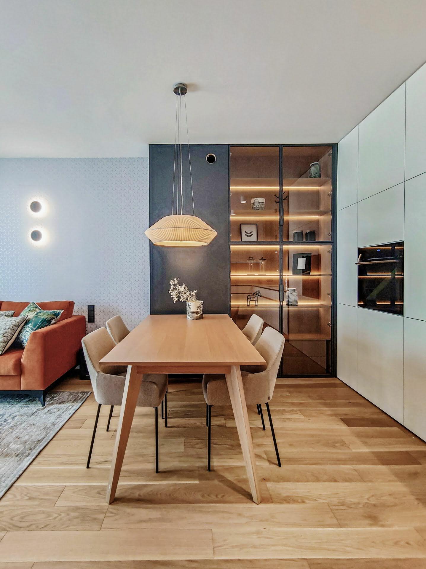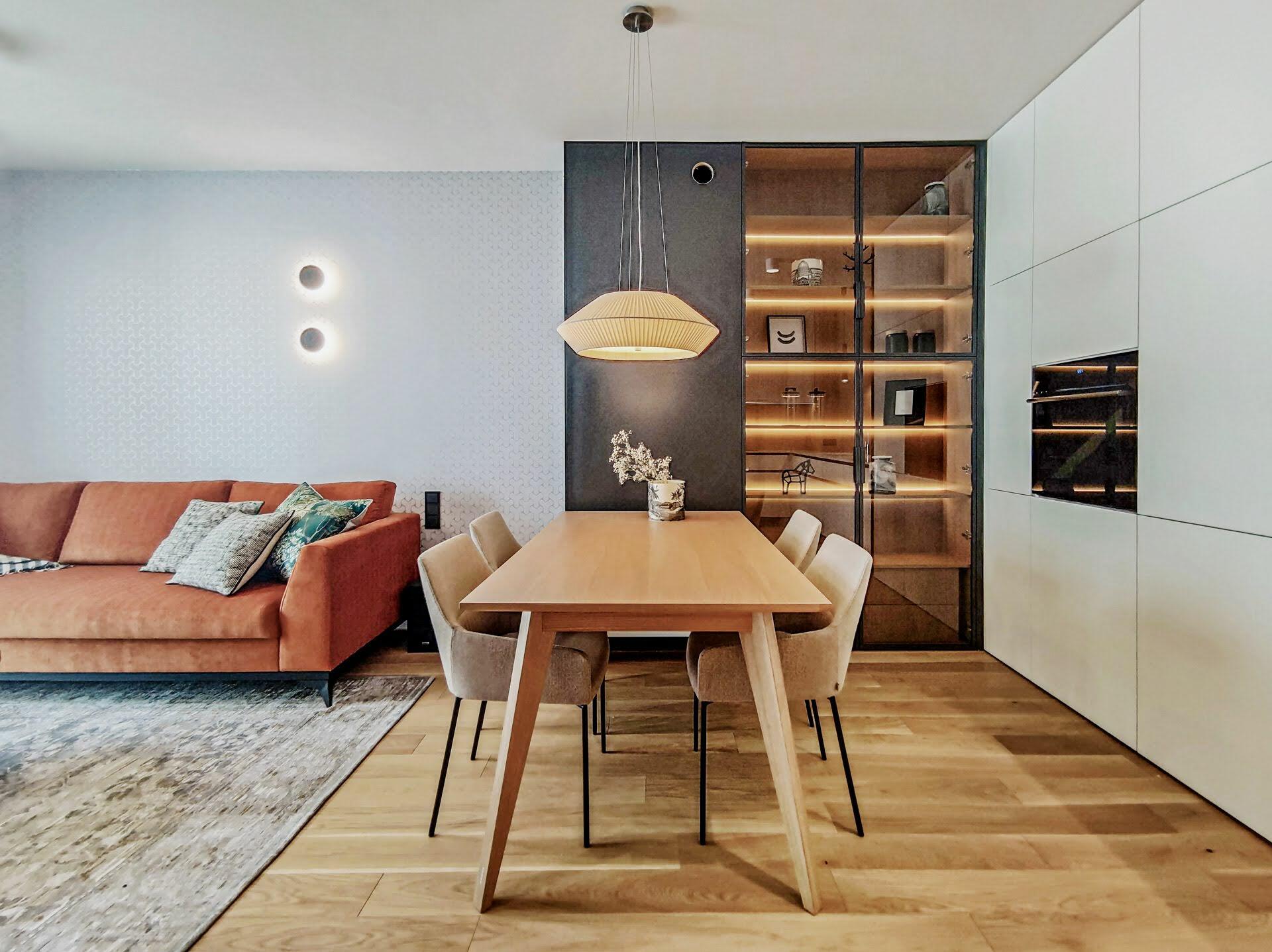 Apartament o powierzchni użytkowej 79,03 m2 dwupoziomowy, jasny, wykończony w wysokim standardzie. Dolną kondygnację zajmuje przestronny salon z aneksem kuchennym. Prywatna część apartamentu, czyli dwie sypialnie (każda z tarasem) i łazienka zajmują górną kondygnację. Meble wykonane na zamówienie tylko dla tego apartamentu. Sprzęty RTV i AGD wysokiej klasy. Podłogi w pokojach i na schodach - deska drewniana.