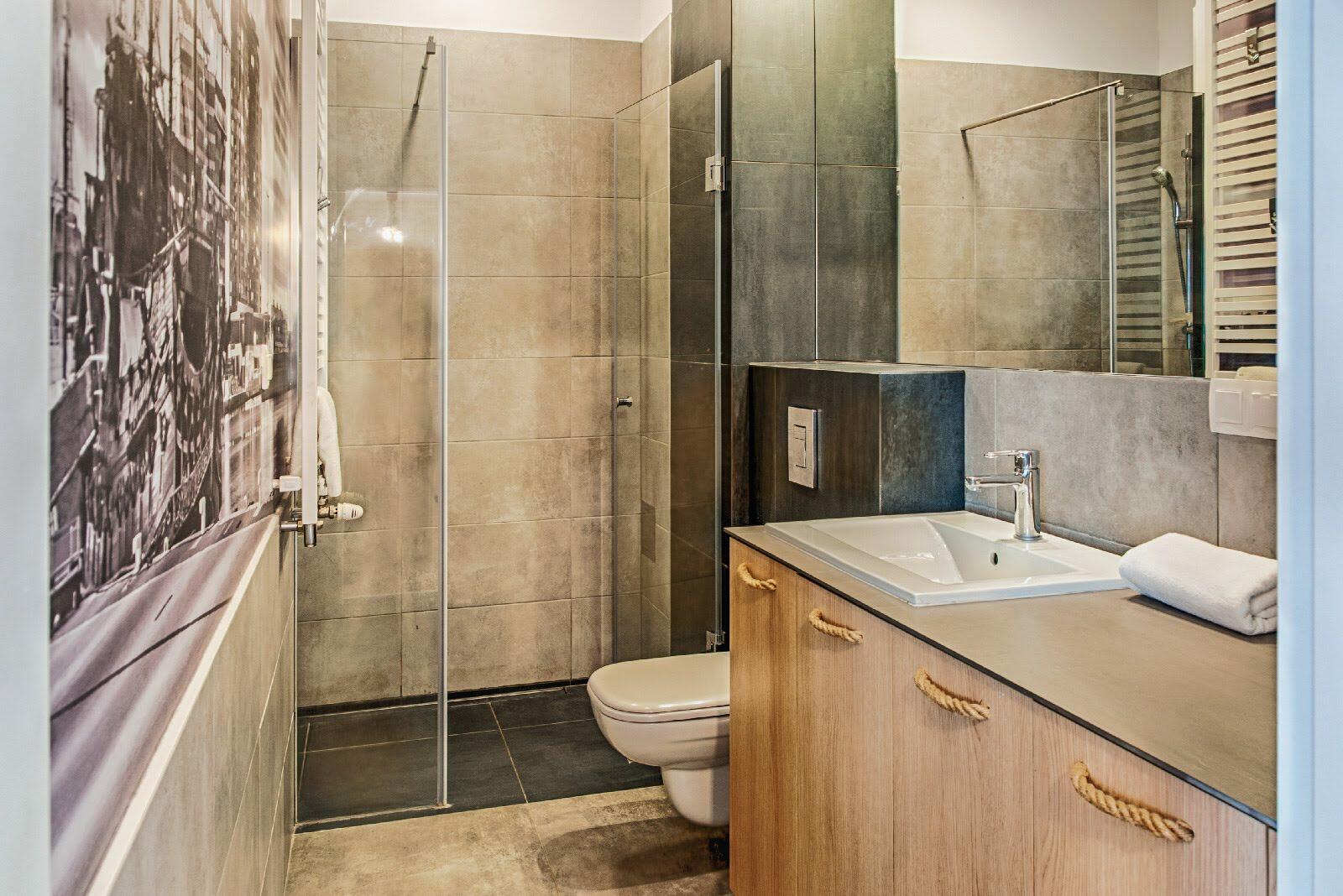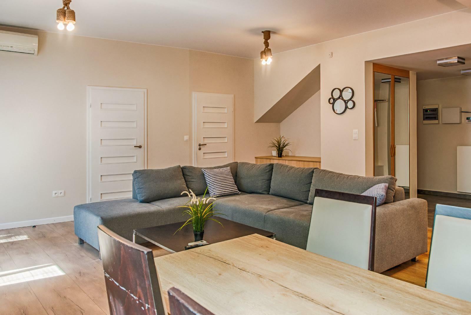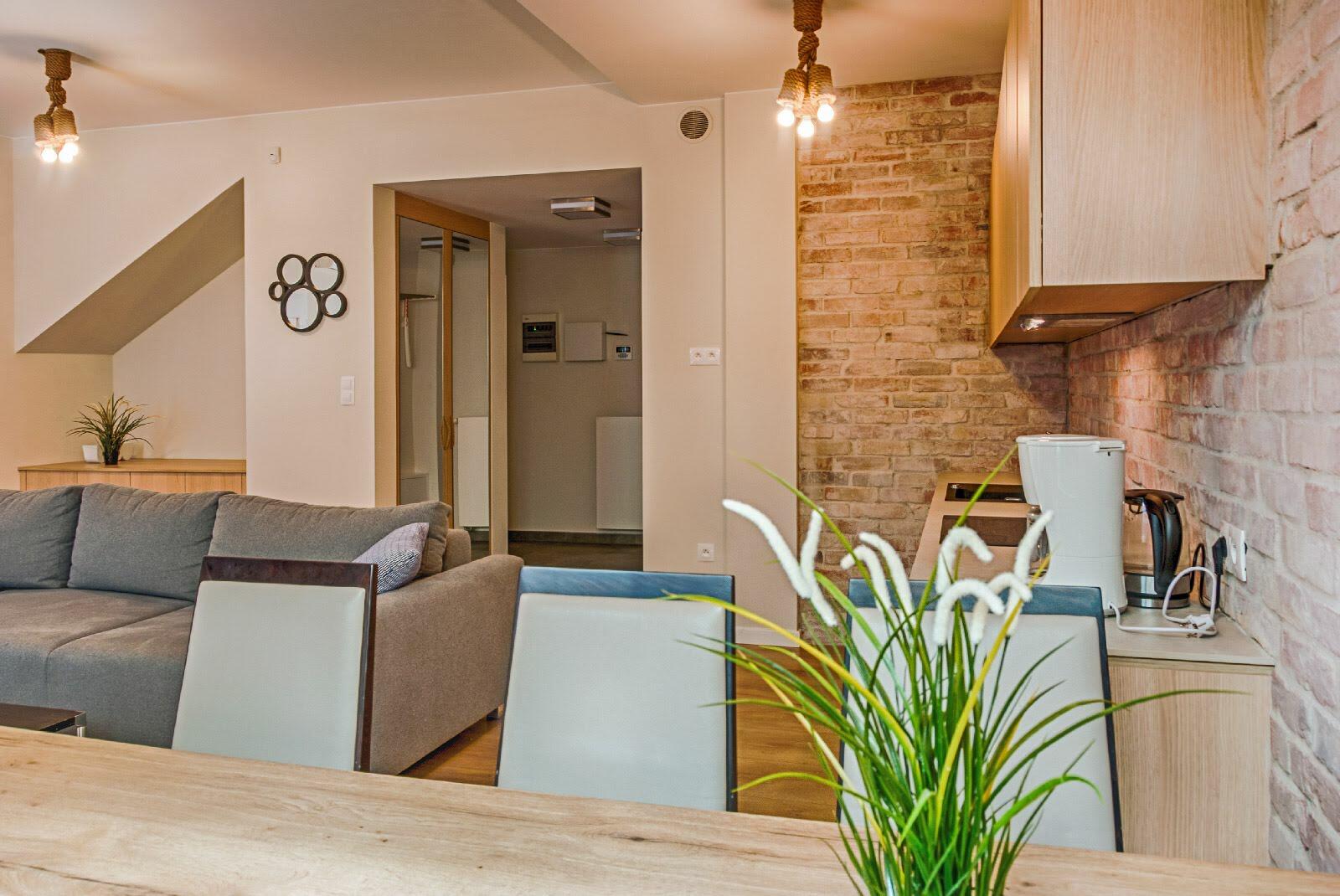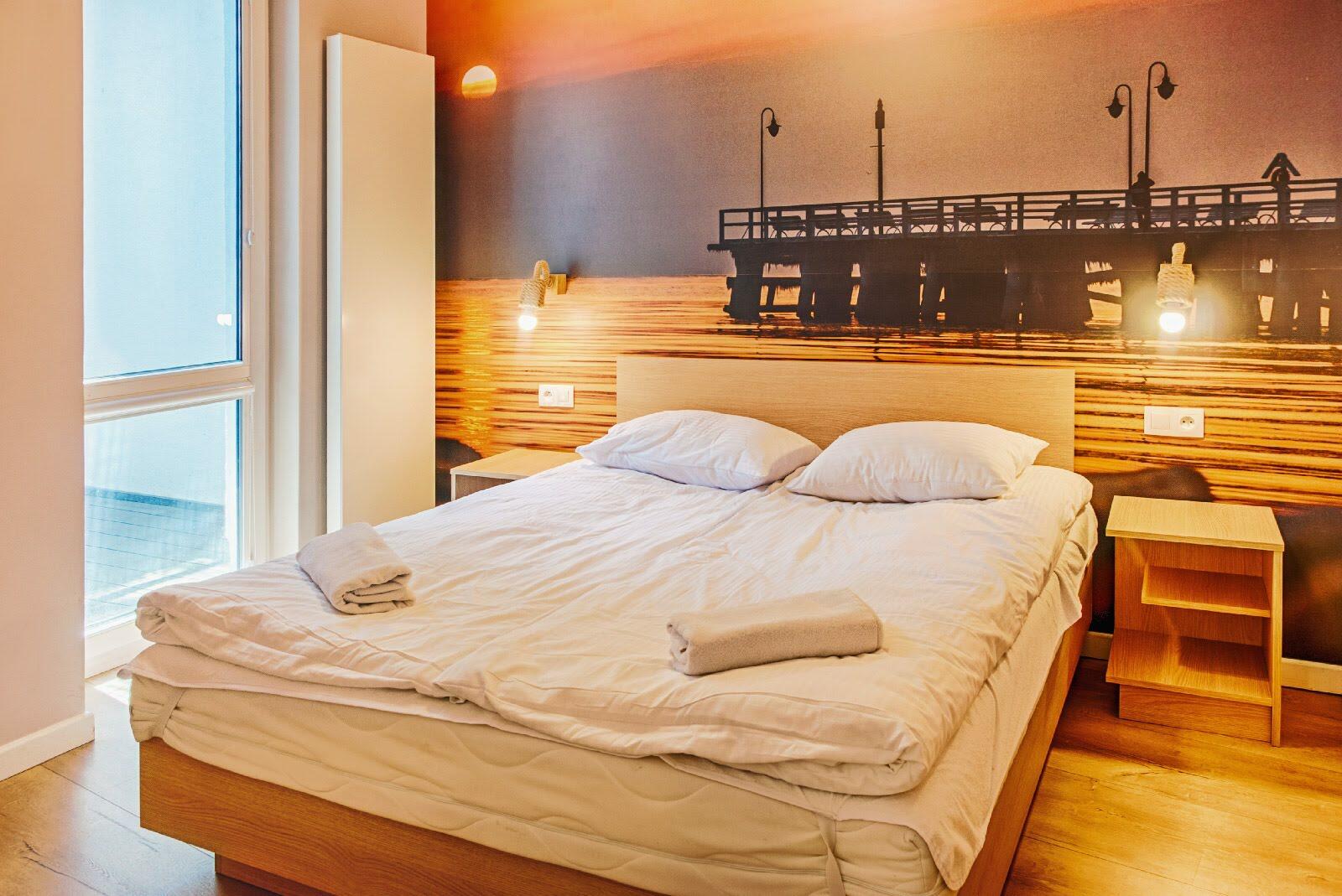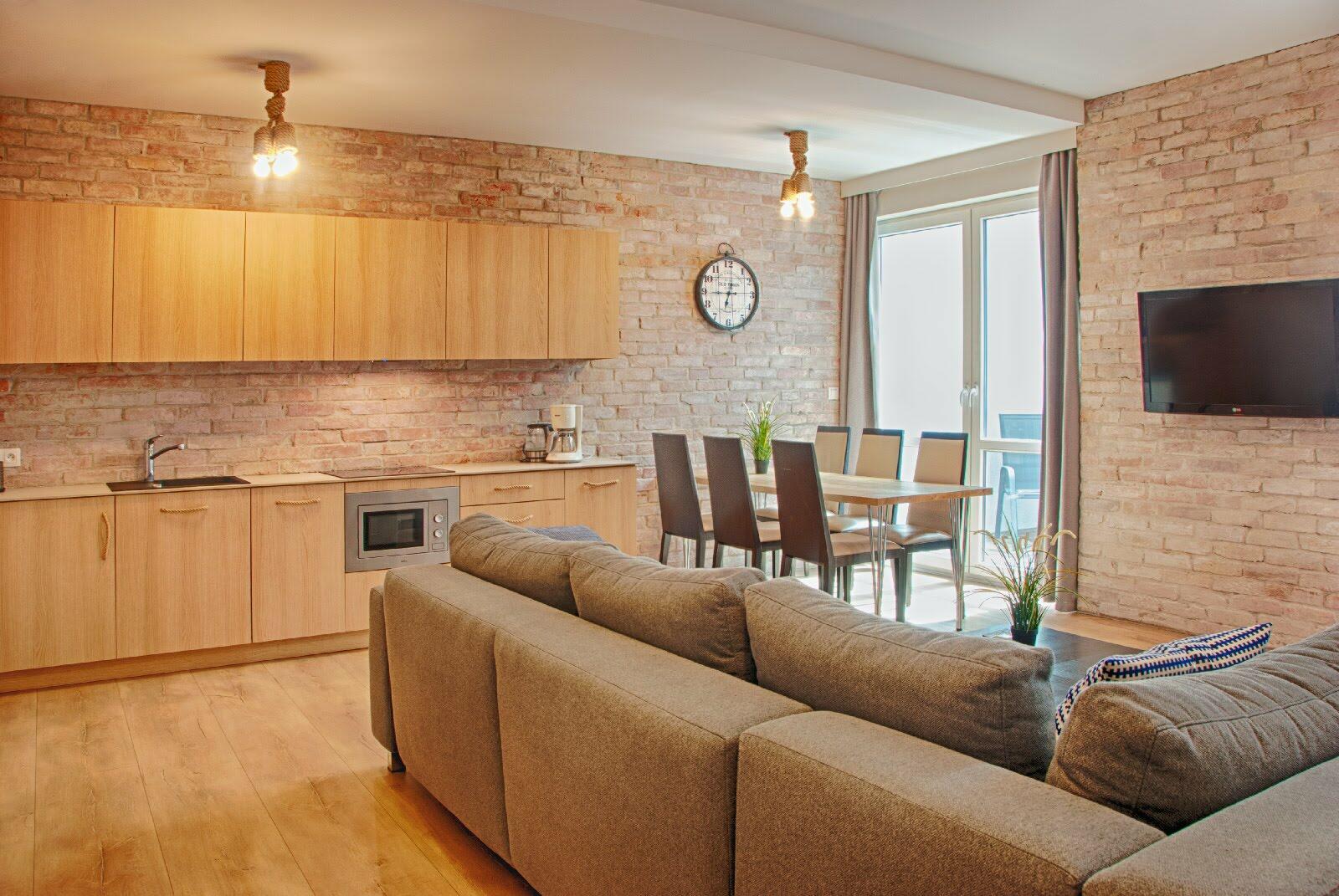 Apartament o powierzchni użytkowej 67,66 m2, jednopoziomowy, bardzo jasny. Składa się z przestronnego salonu z aneksem kuchennym, dwóch sypialni, łazienki z wc oraz przedpokoju. Salon wyposażony w duży narożnik z funkcją spania, stolik kawowy, telewizor oraz stół z sześcioma krzesłami. Aneks kuchenny w pełni wyposażony: płyta grzewcza, mikrofalówka,zmywarka, lodówka. W sypialniach, z wyjściami na tarasy: łóżka dwuosobowe, stoliki nocne, pojemne szafy. Przedpokój z zabudowaną szafą.